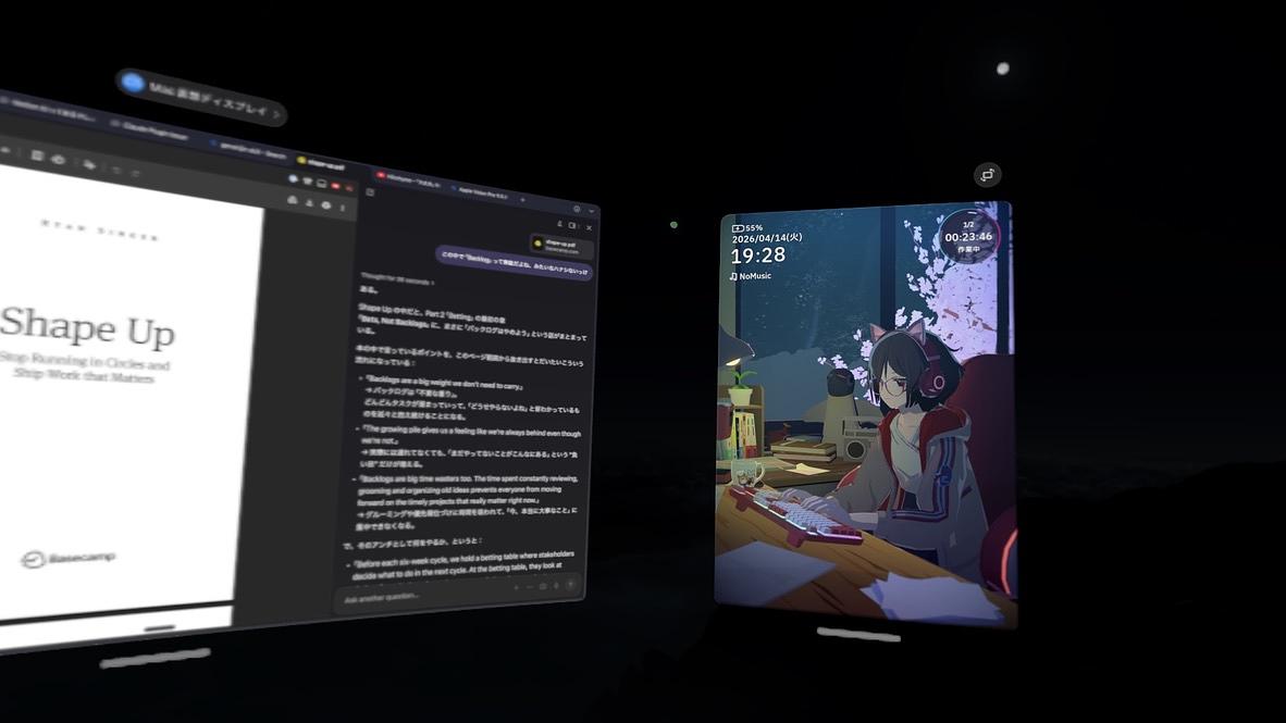 前に話題にあげたChill with youという作業支援アプリがスマホ対応をした。会社パソコンで使えない問題がこれで解消されたのに加えて、iPhoneアプリはVision Pro上でも動かせるので、仮想作業環境においても使えるようになった。これが存外よくて、つい深い時間まで作業を続けてしまった。おもしろいなあ。テクノロジーってのはこういう風に使われてほしいよな。思えば昔はこういうまあ、いわゆるカワイイ女の子みたいなのが出てくるゲームやアプリは「興味ナイゼ!」っていう素振りをしていたけど、そういう自意識もいつか消えたね。カワイイものはカワイイし、カッコイイものはカッコイイ。